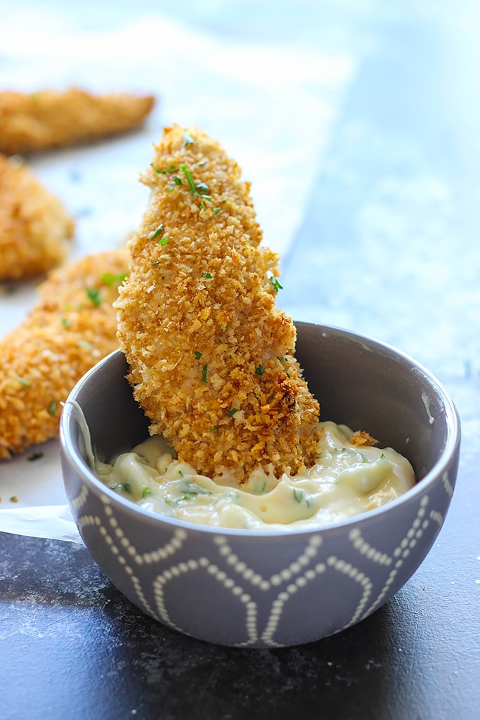4. Using tongs, shake any excess marinade from chicken tenders and dredge through bread crumbs. Pat in any excess bread crumbs