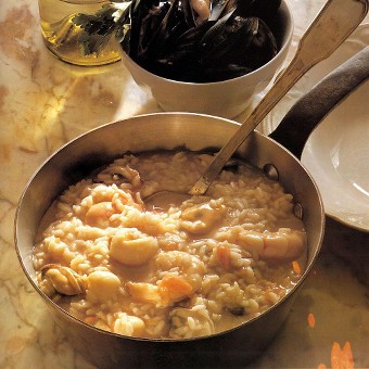 Remove from the heat when there is still a little more liquid than desired, as the rice will continue to absorb it. Mound in warmed shallow bowls and surround each serving with 4 mussels. Sprinkle with the parsley and serve immediately.